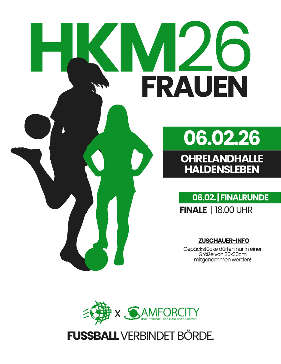 Präsentiert von:KFV BördeHallenbördecup der Frauen06.02.202618:00 UhrOhrelandhalle HaldenslebenDie Frauen spielen um den Hallentitel der BördeHallenbördecup - mitfiebern, anfeuern, Börde-Fußball erleben. Die Hallenkreismeisterschaften der Frauen leiten das HKM-Wochenende der Börde ein.Beim Hallenbördecup der Frauen spielen sechs Teams - jeder gegen jeden - um den Hallenkreismeisterinnentitel.Neueste Beiträge04.02.2026Standorte für die FSA-Kinderfußballtour 2026 gesucht Fußball03.02.2026Hallenkönige bei den Junioren ermitteltFußballSocial-MediaWir sind auch auf Social-Media zu finden.