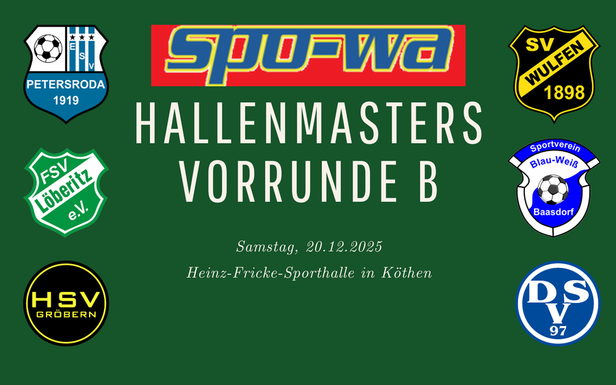 Nach dem am Freitag bereits mit der 1948 Reppichau II und dem 1. FC Bitterfeld-Wolfen II die ersten Mannschaften in die Endrunde des Hallenmasters eingezogen sind, steht heute die Vorrundengruppe B ab 15:00 Uhr in der Köthener Heinz-Fricke-Sporthalle auf dem Plan.