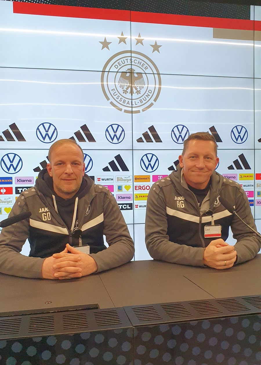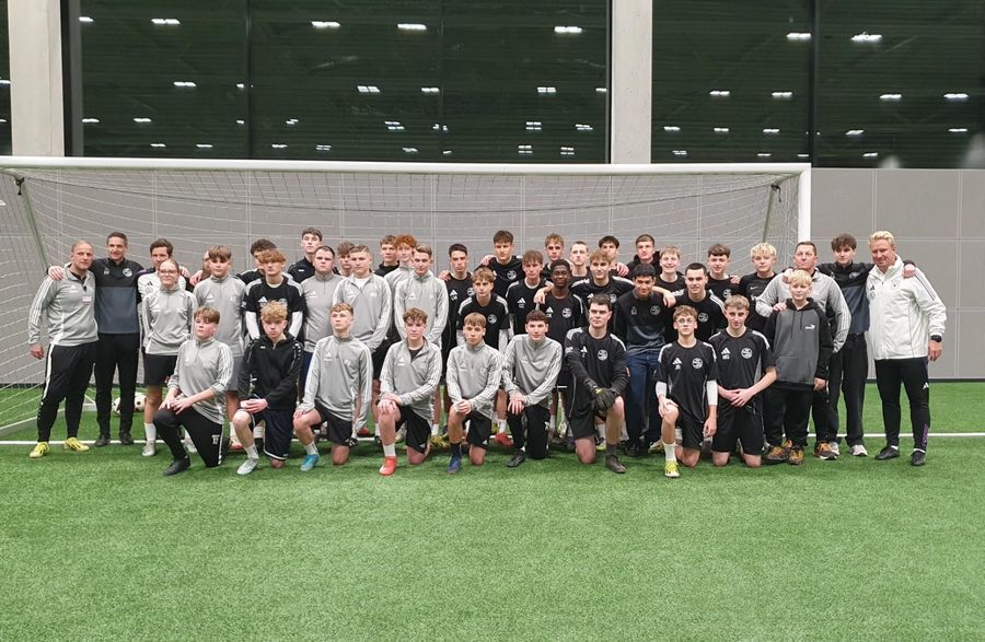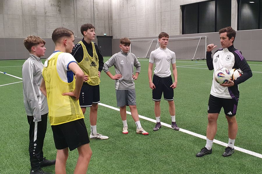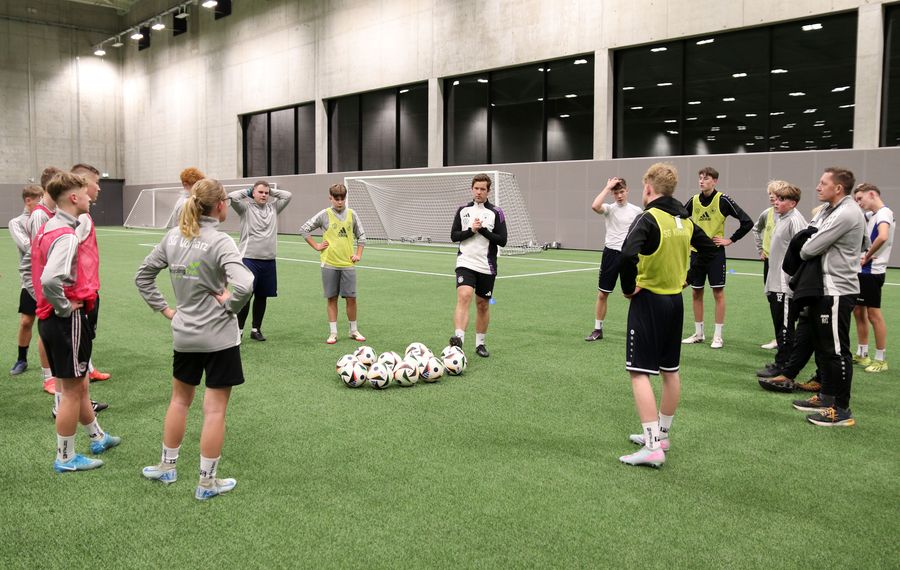 Im Anschluss durften die Nachwuchskicker an einer simulierten Pressekonferenz teilnehmen. Dort saß auch der Kapitän der B-Junioren, Paul Ole Voss, auf dem Podium und schilderte seine Eindrücke: „Auf dem Podium zu sitzen war erst ungewohnt, aber dann richtig cool. Den DFB-Trainern direkt Fragen zu stellen, war ein krasses Gefühl. Der Tag hat uns mega motiviert.“ Auch aus Sicht des Trainerteams war der Besuch ein voller Erfolg. Sie fassten es treffend zusammen: „Das Training war wirklich intensiv und hat den Jungs einiges abverlangt – aber genau das hat ihnen auch riesigen Spaß gemacht. Die Mischung aus hoher Professionalität, neuen Übungen und der besonderen Atmosphäre hat sie unglaublich motiviert. Dieser Tag war ein Geschenk für die Mannschaft und wird ihnen noch lange in Erinnerung bleiben.“