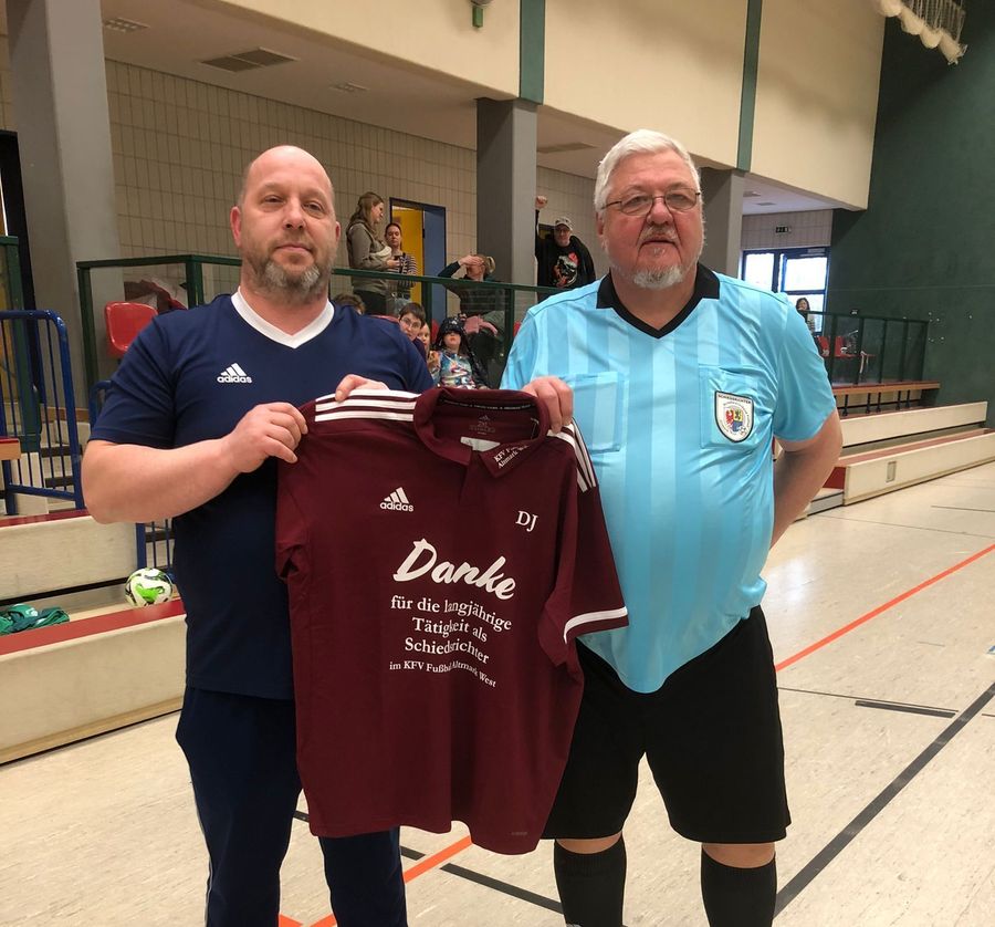 Im würdigen Rahmen der Hallenkreismeisterschaft der Herren Ü32 wurde Schiedsrichter Dennis Jonescheit offiziell verabschiedet. Nach vielen Jahren engagierter und zuverlässiger Spielleitung beendet er seine aktive Laufbahn an der Pfeife.