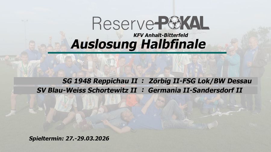 Im Reservepokal stehen die Partien noch nicht final fest: Der Gegner der SG Reppichau II wird am 10.12.2025 unter Flutlicht in Zörbig zwischen dem ZFC II und der FSG LOK/BW Dessau ermittelt und die zweite Mannschaft des SV Blau-Weiß Schortewitz empfängt den Sieger aus CFC II und Sandersdorf II.