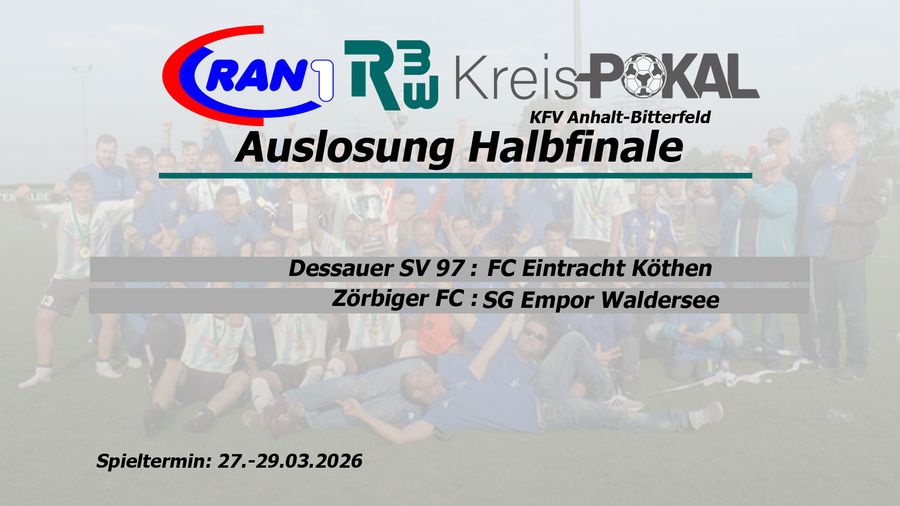Nach dem historischen Viertelfinale im RAN1-RBW-Kreispokal mit vier Entscheidungen im Elfmeterschießen waren am Dienstag nur noch Landesklassisten im Lostopf für das Halbfinale des Cups enthalten. Der Vorsitzende des Spielausschusses Philipp Seyffert loste dabei dem verbleibenden Titelträger Dessauer SV 97 aus der LK 4 den FC Eintracht Köthen aus der LK 5 zu. Die zweite Partie ist ebenfalls eine staffelübergreifende: Der Zörbiger FC aus der LK 5 empfängt die SG Empor Waldersee aus der LK 4.