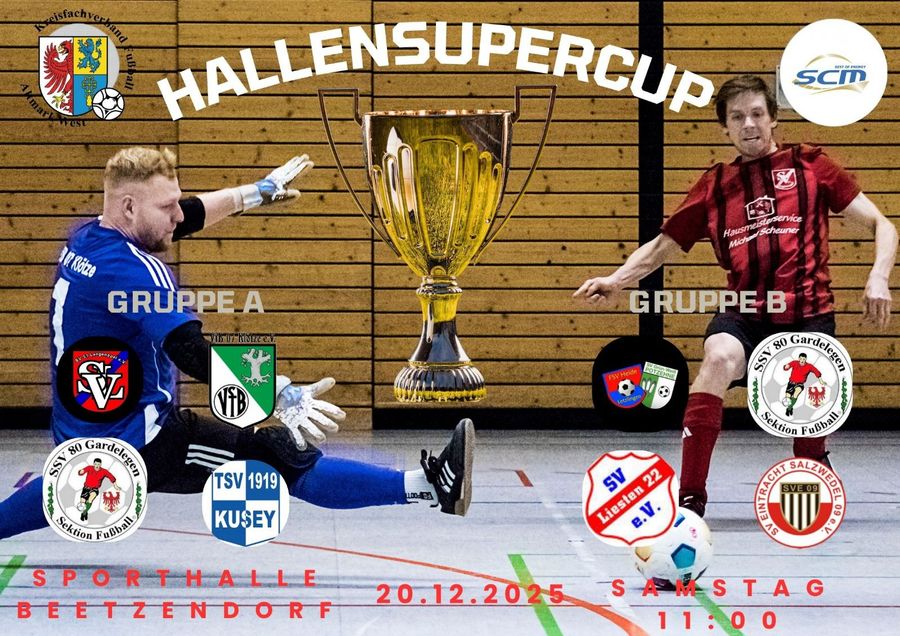 Zum Jahresende findet das Highlight im Hallenfußball des KFV Fußball Altmark West statt. Beim Hallensupercup am 20.12.2025 treffen ab 11:00 Uhr unsere Teams der Landesliga, Landesklasse, sowie der Tabellenerste der KOL (Stand 08.12.2025) in der Beetzendorfer Sporthalle in zwei ausgelosten Gruppen aufeinander.