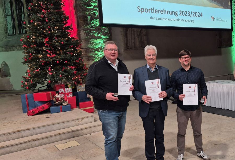Für ihr ehrenamtliches Engagement im Stadtfachverband Fußball Magdeburg erhielten die Sportkameraden Hartmut Agte, Wolfgang Pujo und Jan Förster von Oberbürgermeisterin Simone Borris ein Ehrenabzeichen und eine Ehrenurkunde.