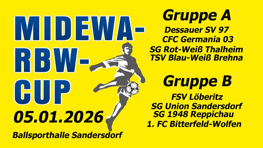 Der 11. MIDEWA-RBW-Cup wird am 05.01.2026 um 18:00 Uhr durch den Turnierneuling vom Dessauer SV 97 in der Partie gegen den CFC Germania 03 aus Köthen eröffnet. Die Teams aus Brehna und Thalheim vervollständigen die Gruppe A. In der Gruppe B finden sich dann gesammelt zahlreiche Halbfinalisten der vergangenen Jahre: FSV Löberitz, SG Union Sandersdorf, SG 1948 Reppichau und 1. FC Bitterfeld-Wolfen.
